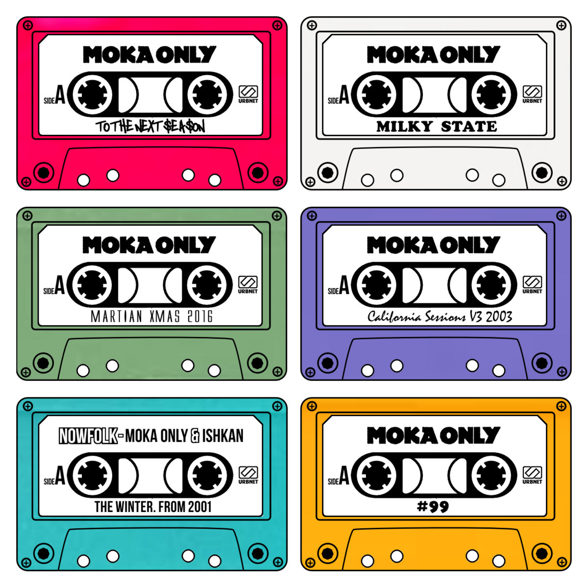 Set includes 6 Cassettes (#99, California Sessions Vol. 3 [2003] , Milky State, The Winter. From 2001 Nowfolk (Moka Only & Ishkan) , Martian XMAS 2016 , To The Next Season). All 6 Cassettes come in a white, bi-fold cassette album case, and stickers