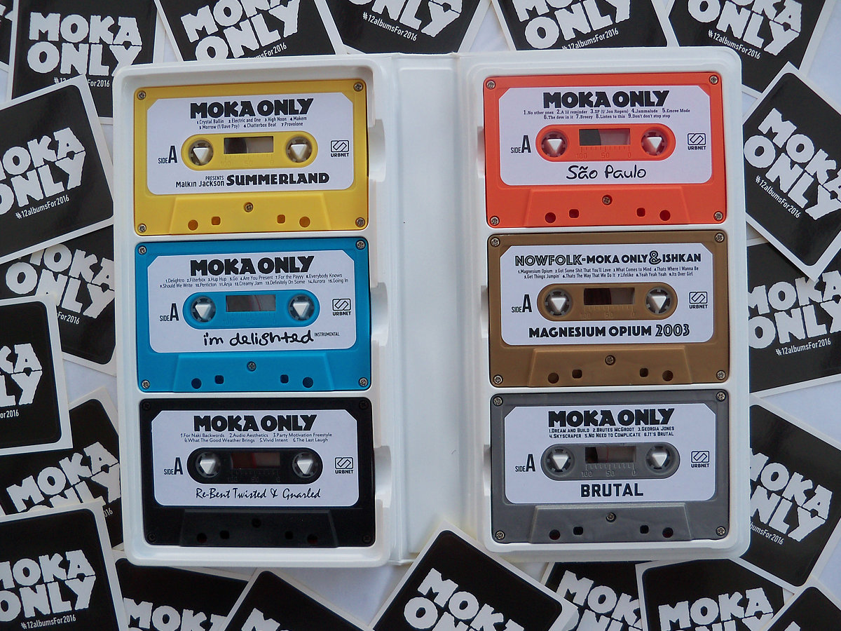 Set includes 6 Cassettes (Brutal, Magnesium Opium 2003, São Paulo, Re-Bent Twisted & Gnarled, I'm Delighted Instrumental, and Moka Only presents Malkin Jackson - SUMMERLAND). All 6 Cassettes come in a white, bi-fold cassette album case, and stickers